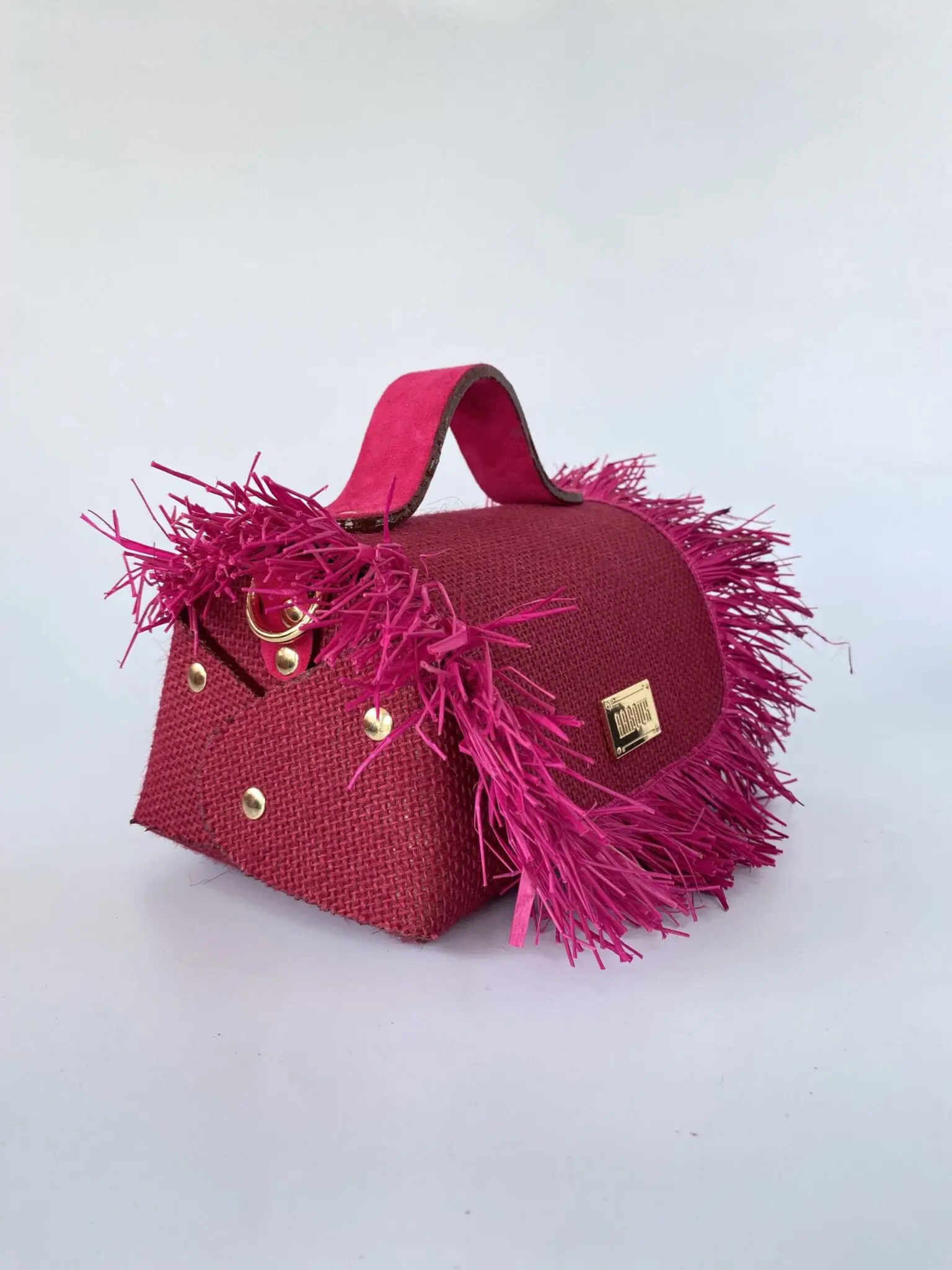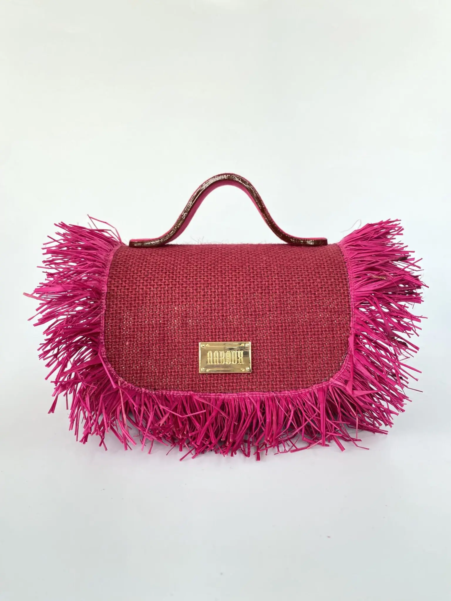 Our luxury signature bag, the Mira, is a compact and curvy wide-base top-handle bag (can also be worn as a crossbody bag) made from sustainable Jute & Raffia featuring our distinct stitch-less construction, adorned with a signature logo and comes in a variety of colours. Jute & Raffia (outer), Suede Lining (inner). Chain strap included. Care Your AABOUX bag is made from Jute & Raffia. It represents countless hours of craftsmanship.